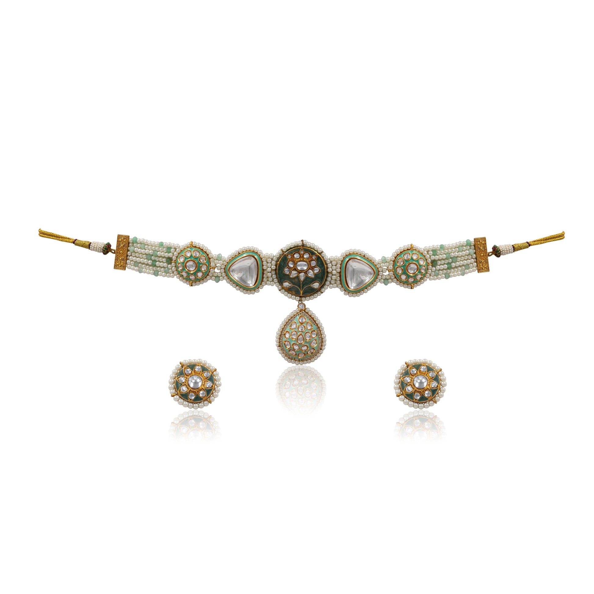 Mint Green Kundan Pearl Choker Set – Hand-Painted Lotus with Polki Sparkle