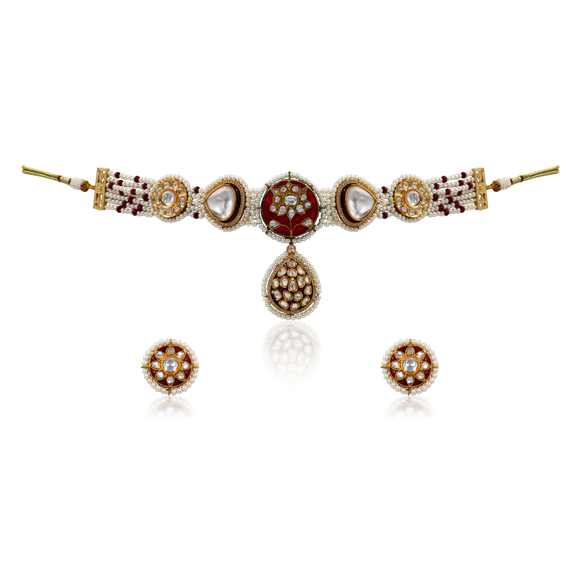 Ruby Red Kundan Pearl Choker Set – Enamel Lotus & Polki Drop
